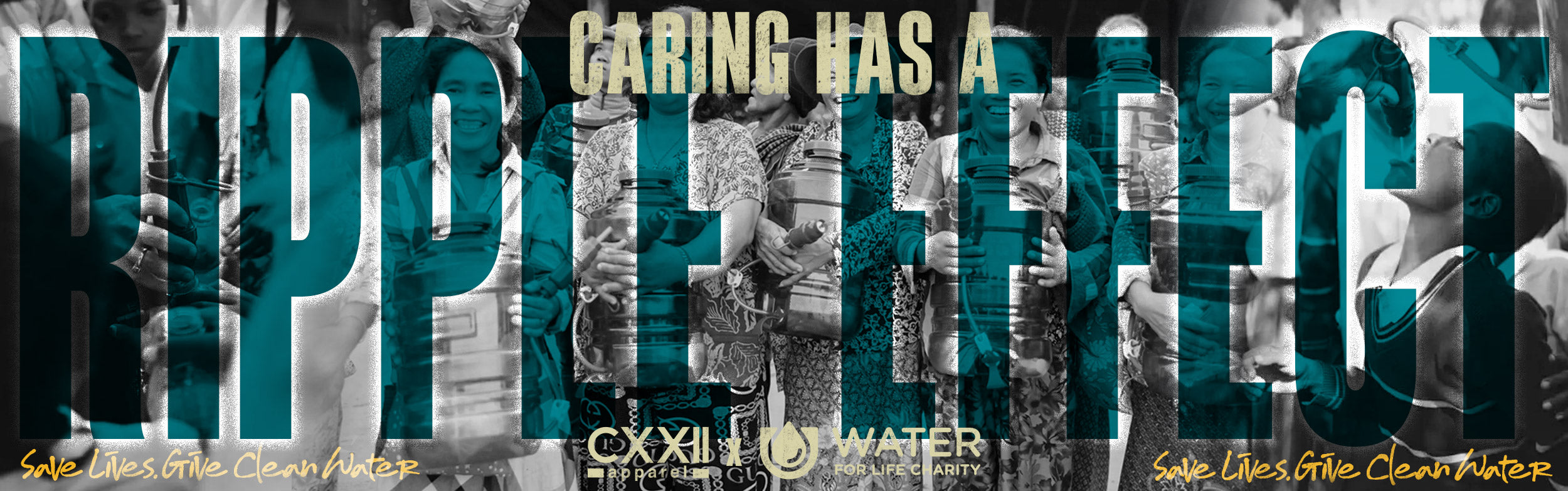 CXXII Apparel has partnered with Water for Life Charity to help raise awareness and support to give provide these clean water, You can help through a direct donation or through purchasing our "Ripple Effect Collection" tees and hoodie. (*All profits will go to purchase Filter Kits)