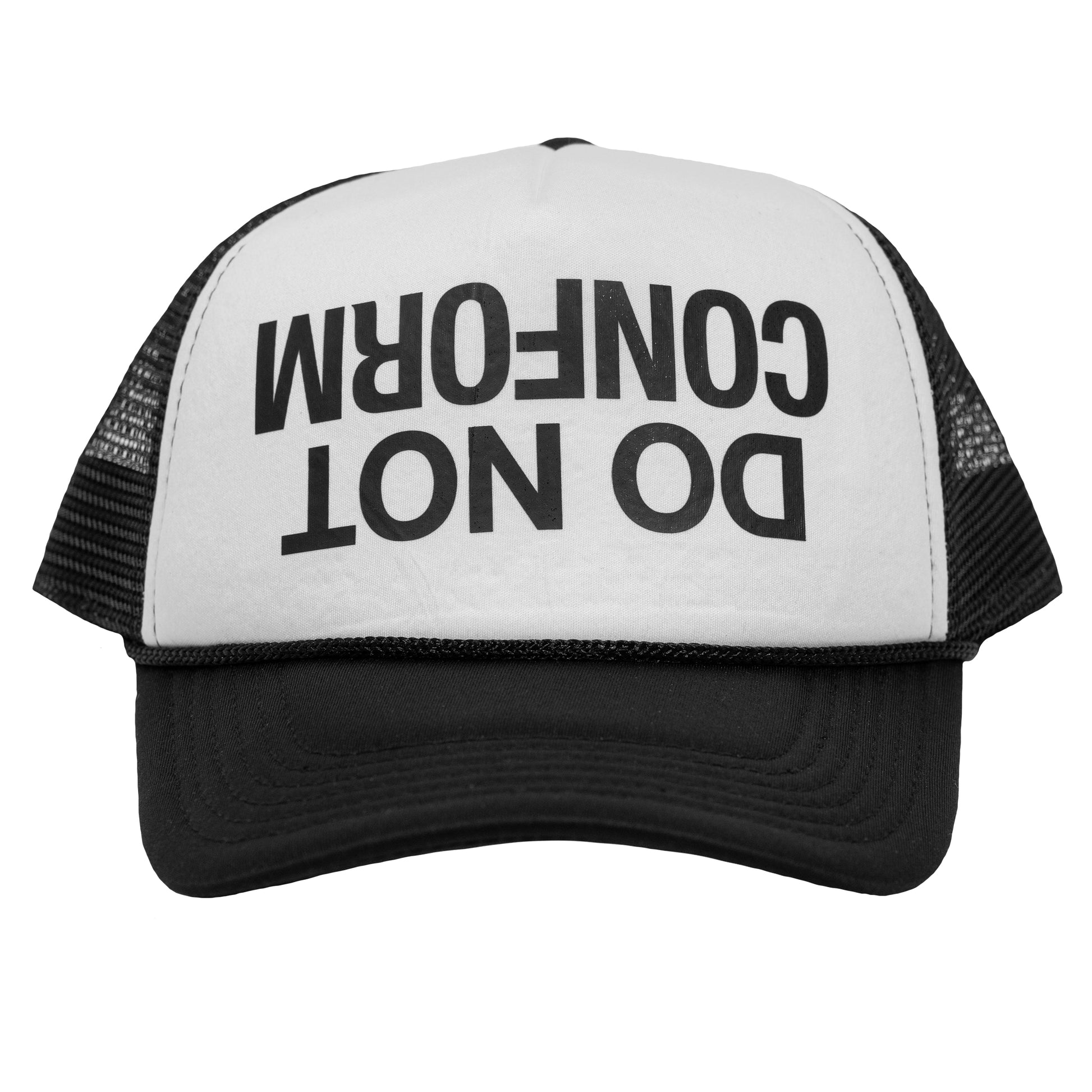 The CXXII Apparel "Do Not Conform Inverted" Black / White Foamy Trucker Hat.