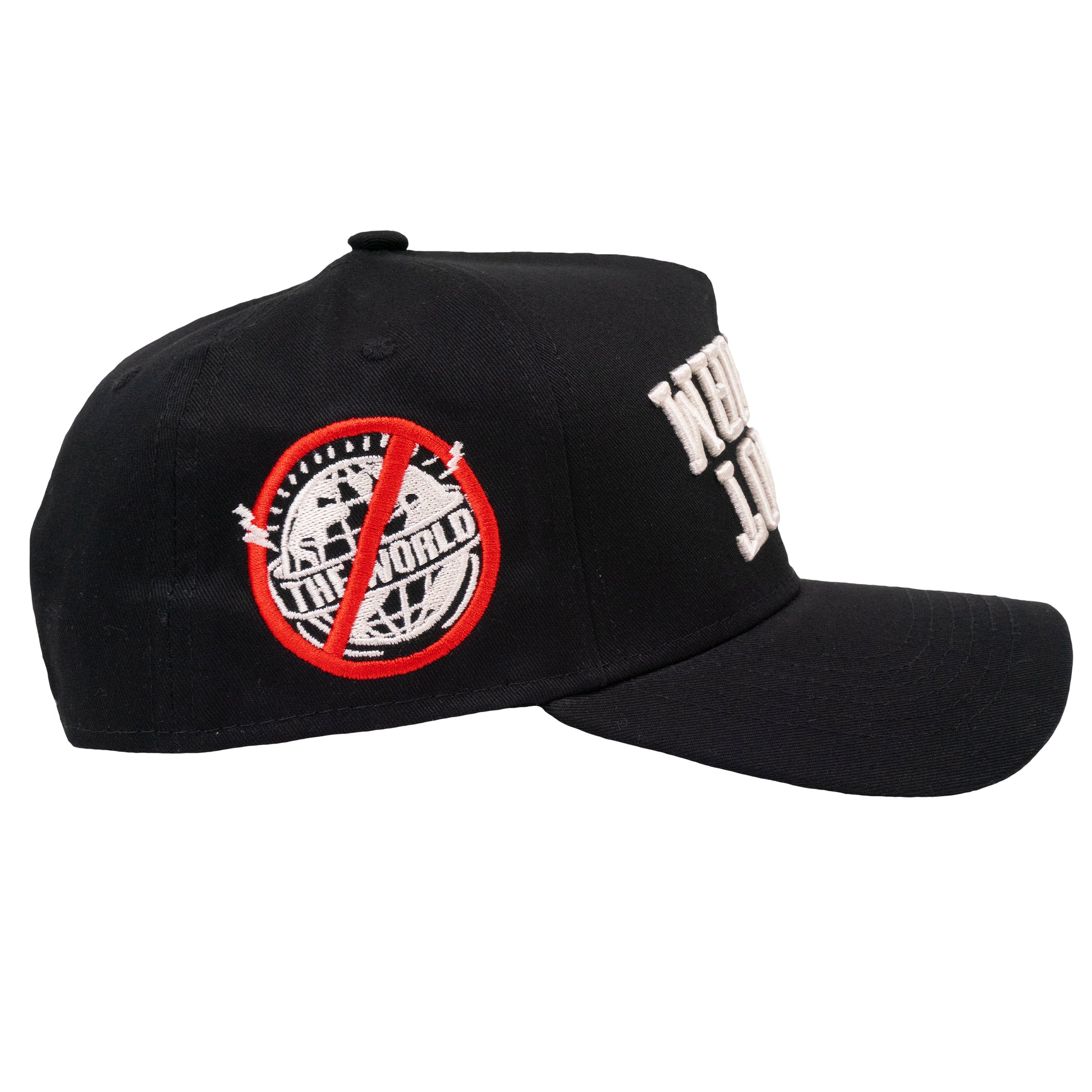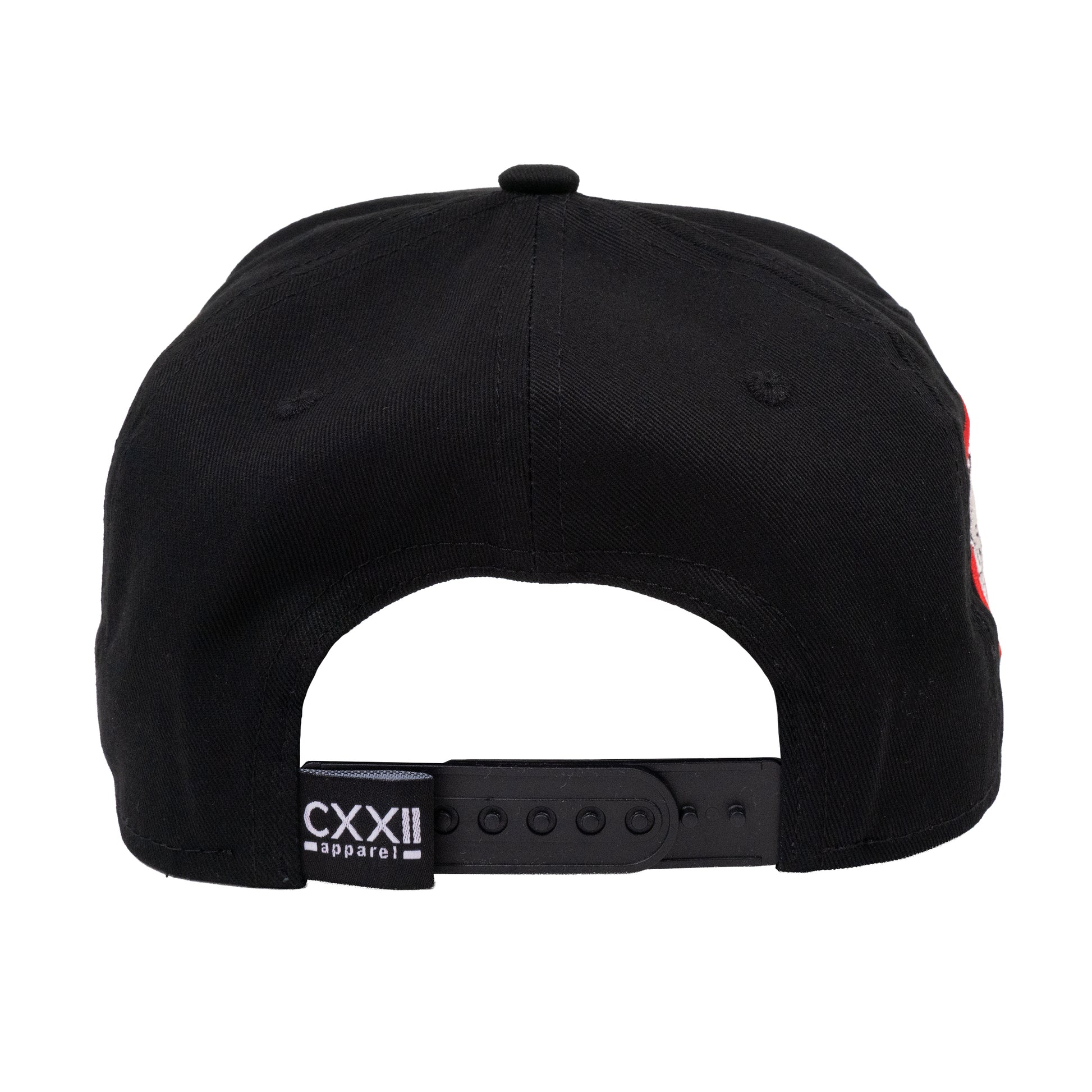 The CXXII Apparel "ndsᴉpǝ poʍu" Black Classic 5 Panel Curved Brim Snapback.