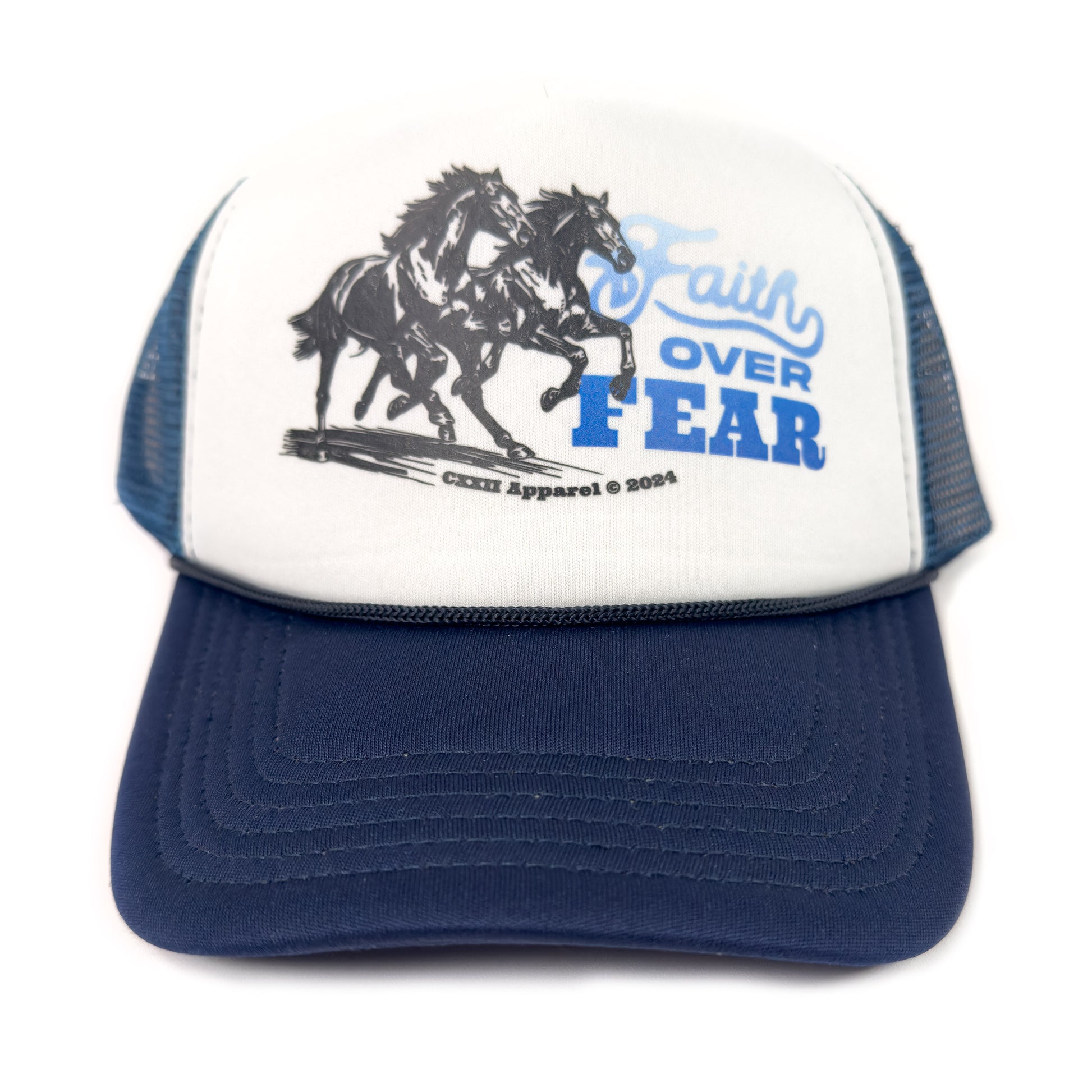 The CXXII Apparel "Faith Over Fear" Navy Classic Snapback Foam Trucker Hat.